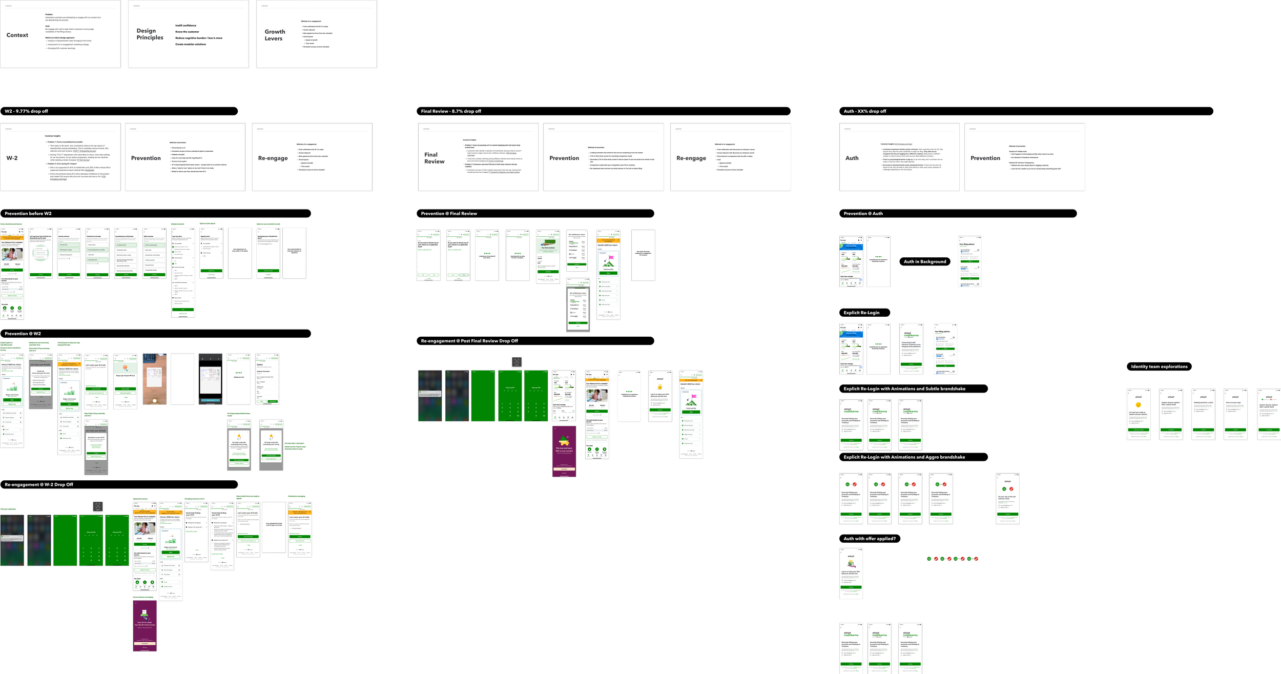Before we narrowed to working on the Wages and Income topic section, we identified the top abandonment sections in our end to end. This included 1) Wages and Income, 2) Final Review, and 3) Authentication. I was partnered with another designer to tackle these abandonment topics and come up with scrappy designs. We took about 2 days to come up with some designs and presented them to our cross functional partners. As a team, we collectively agreed to focus on one section due to time constraints. We narrowed to the Wages and Income section because we saw the highest abandonment rates happening here.