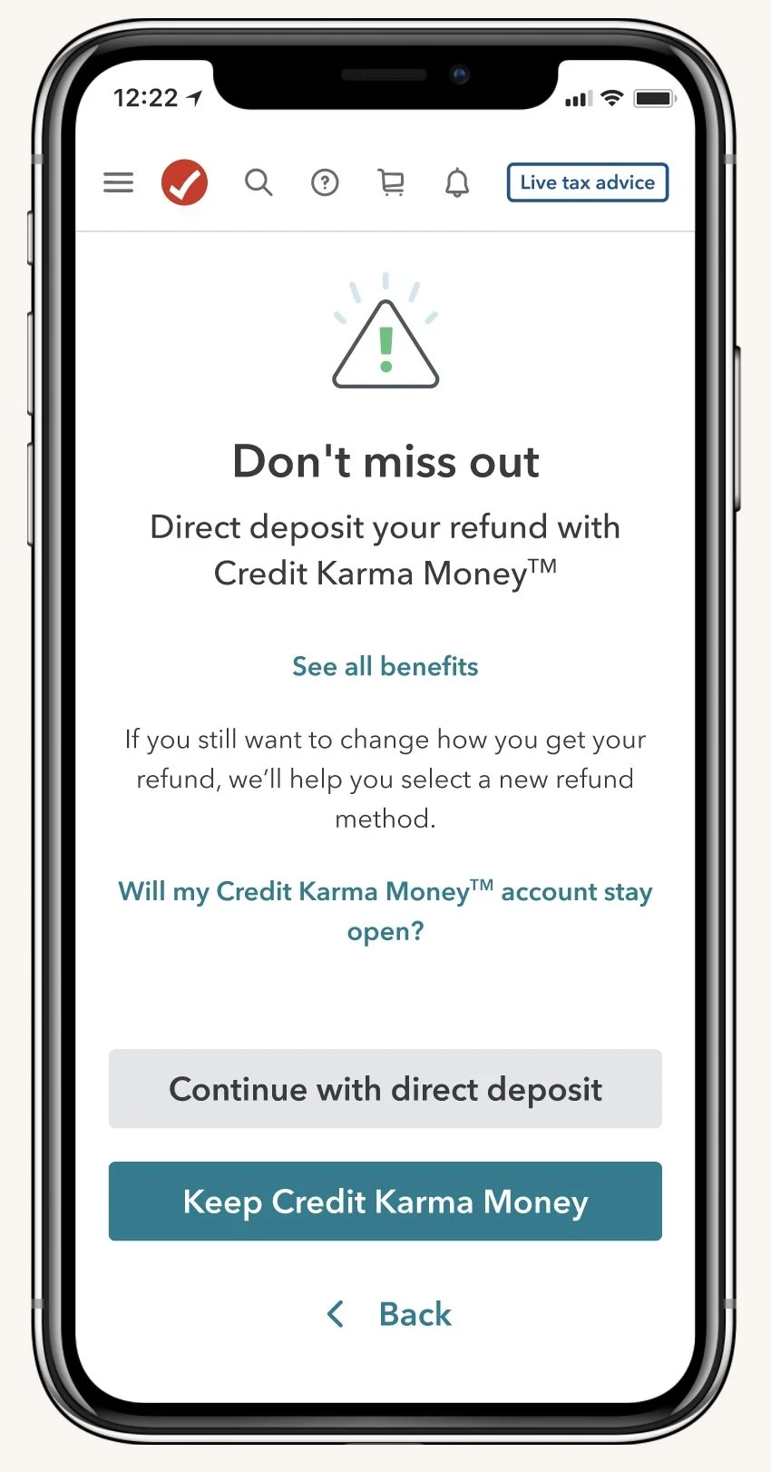 The existing Heartbreaker design can be seen as a disjointed experience. When a customer goes back to the refund selection screen to review or change their refund deposit method, the heartbreaker experience is triggered as a new screen. On top of that, the design and copy do not highlight the benefits of a Credit Karma Money account. This design can be seen as yet another screen in an already long process of filing taxes. I questioned how might we be able to highlight the benefits of a Credit Karma Money account without adding to screen fatigue for customers?